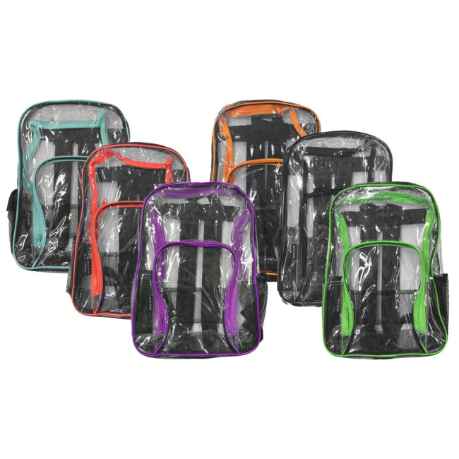 PVC clear or see-thru backpacks in bulk case of 24. All neon colors on trim, a large main section to hold notebooks, binders, and personal items. The front pocket includes a mesh organizer for all your writing tools.